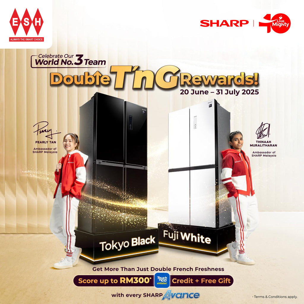 Double the Freshness, Double the Rewards! 🎉 Get ready for Double TnG Rewards with SHARP! 🎁 Bring home the sleek Avance fridge in Tokyo Black or Fuji White and score up to RM300 Touch ‘n Go credit plus a free gift. Offer valid from 20 June – 31 July only at ESH — don’t miss it! Sharp SJF889WGM 780L Hikaru Series Multi Door Refrigerator