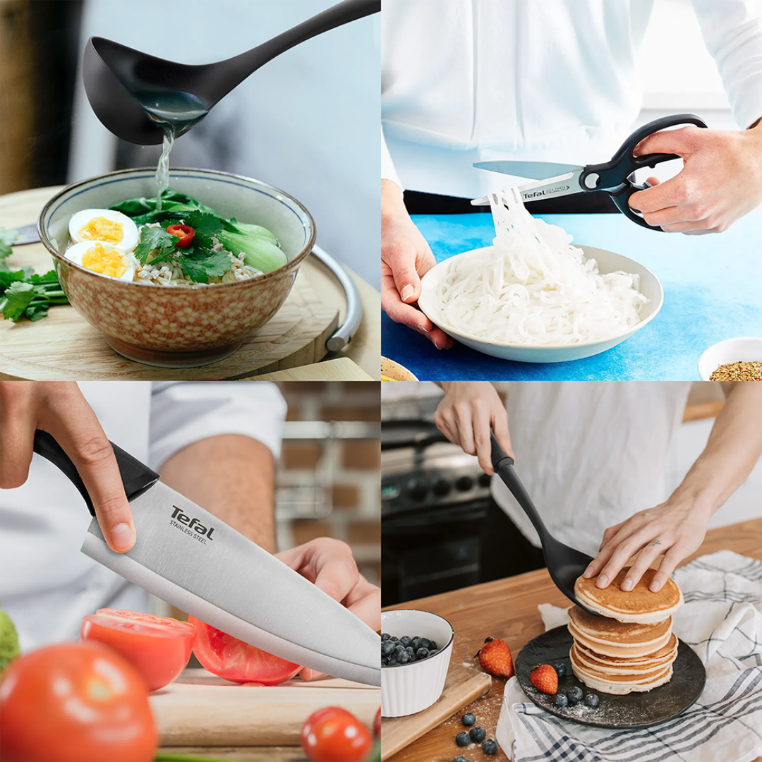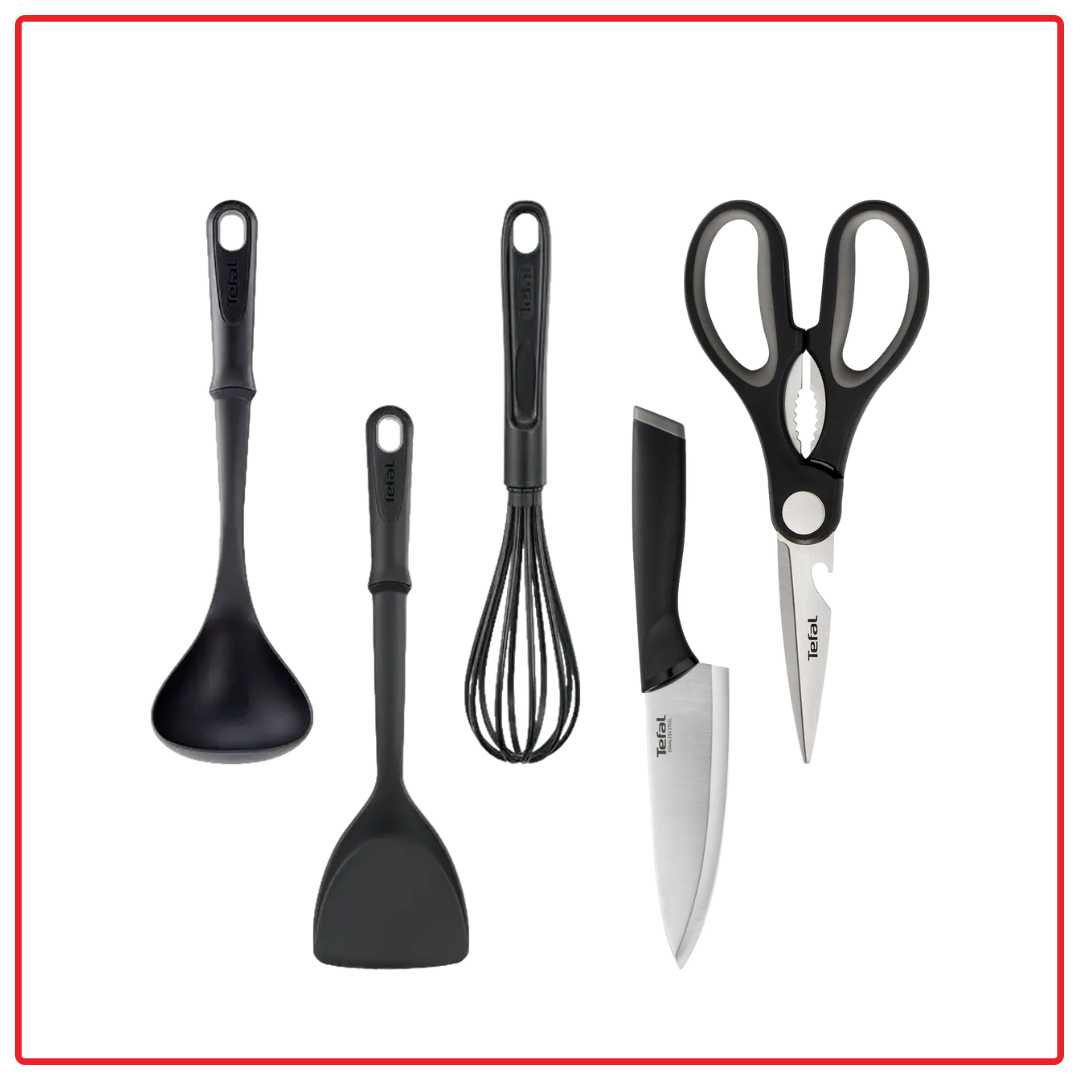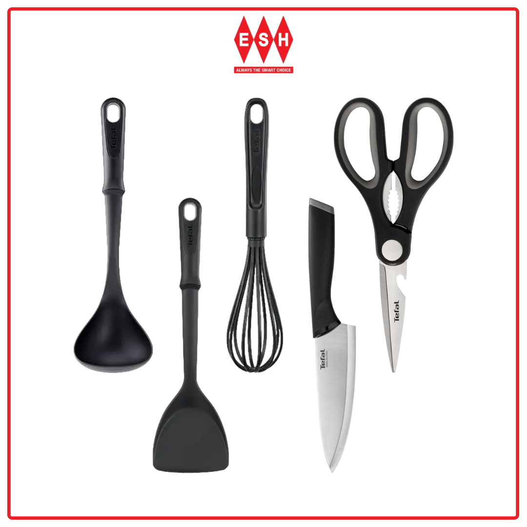 TEFAL KITCHENWARE 5 PCS SET (CHEF KNIFE 15CM + KITCHEN SHEARS 21CM + LADLE SPATULA + WOK SPATULA + BIEVENUE WHISKS) | ESH