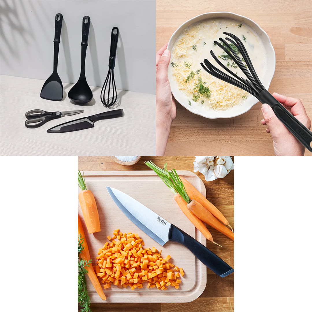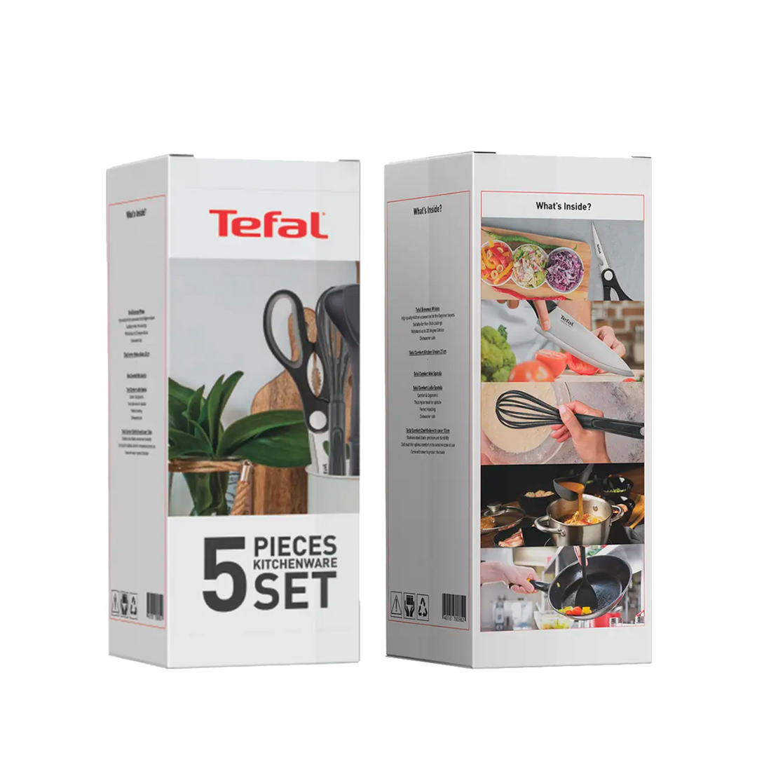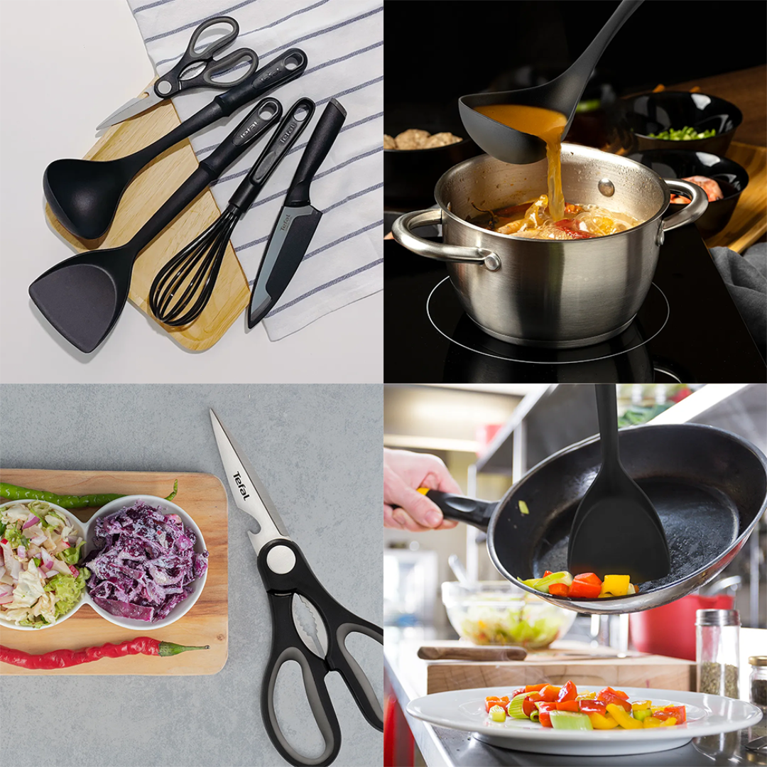 TEFAL KITCHENWARE 5 PCS SET (CHEF KNIFE 15CM + KITCHEN SHEARS 21CM + LADLE SPATULA + WOK SPATULA + BIEVENUE WHISKS) | ESH