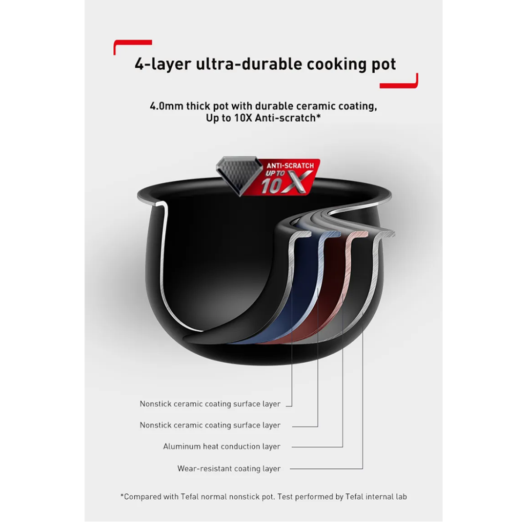 •The rice cooker's pot boasts 10x stronger anti-scratch performance** thanks to a thick 4 mm design