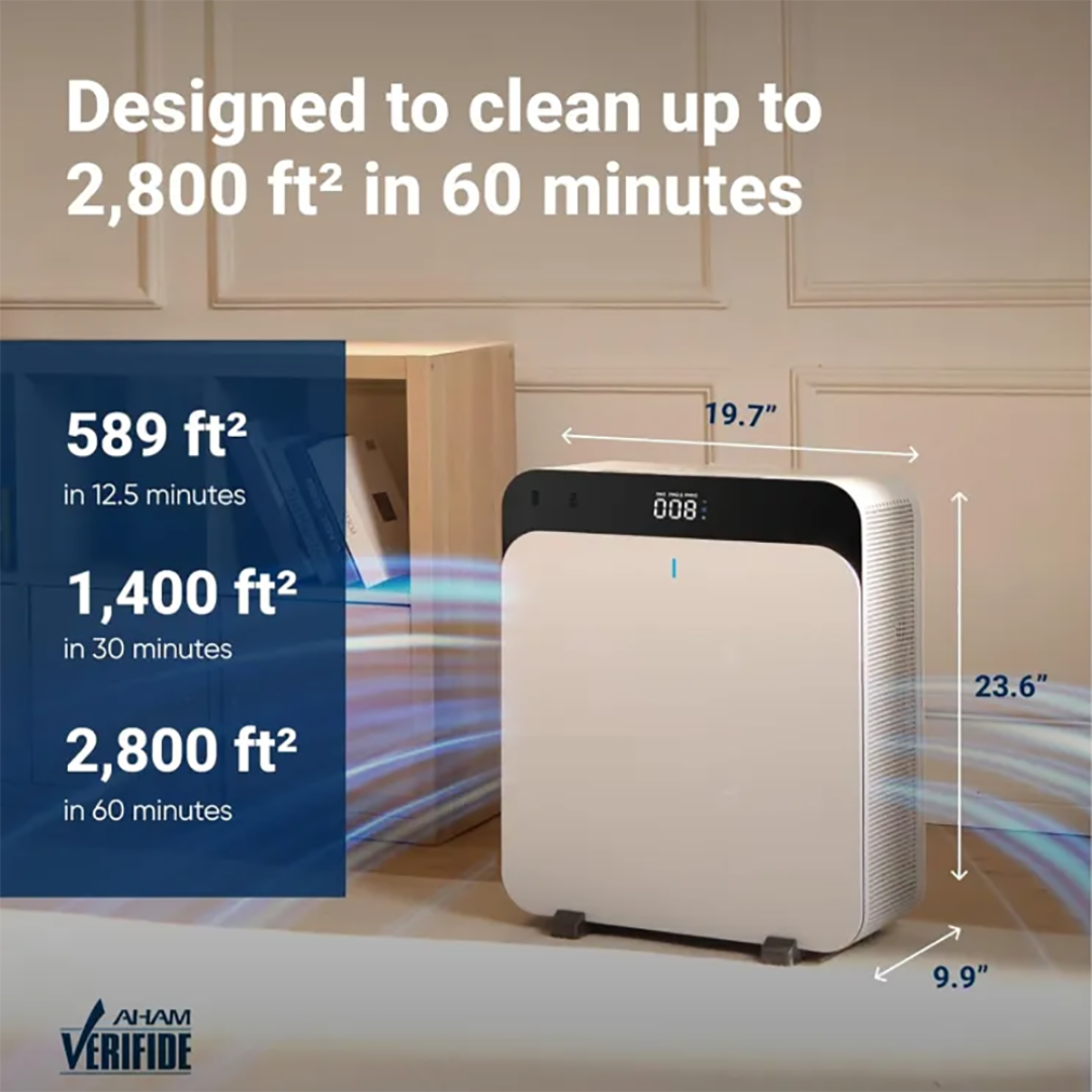 Rapidly cleans 580 ft² in 12.5 minutes. Filters room air at the industry-recommended rate of 4.8x an hour (or about every 12.5 minutes) in a 580 ft² room to effectively lower particle levels and maintain a comfortable environment in master bedroom, living room, and playroom.
