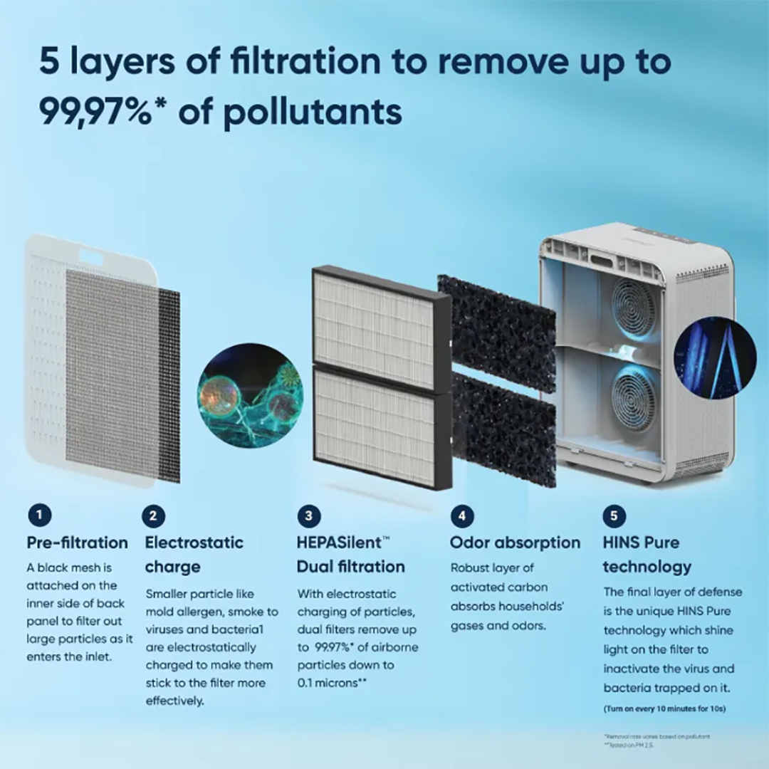 •5 layers of filtration removes 99.97%² of airborne pollutants