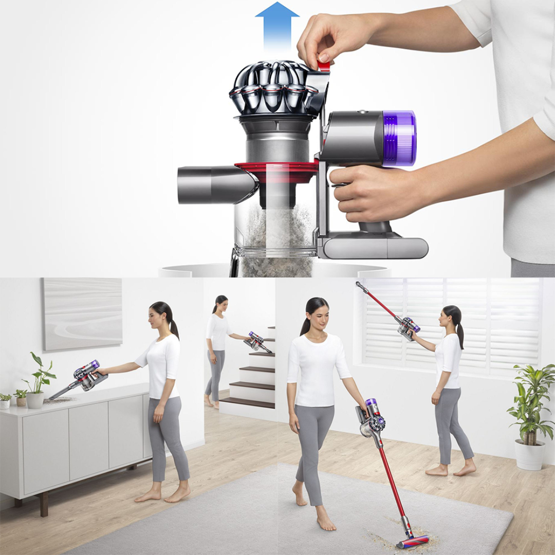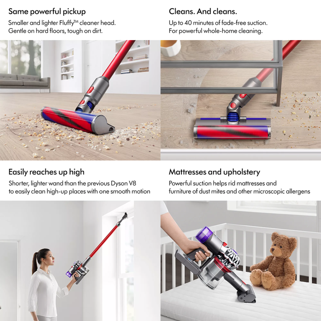Shorter, lighter wand than the previous Dyson V8 vacuum to easily clean high-up places with one smooth motion. 40 minutes of continuous, fade-free suction in Powerful suction mode (30 minutes with a motorised head).