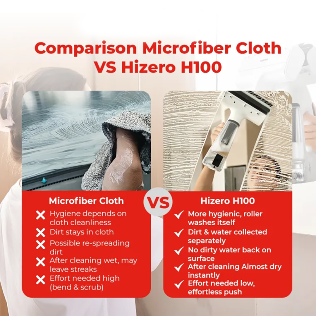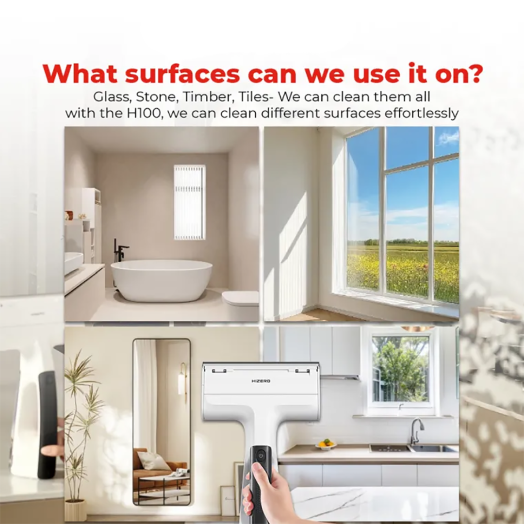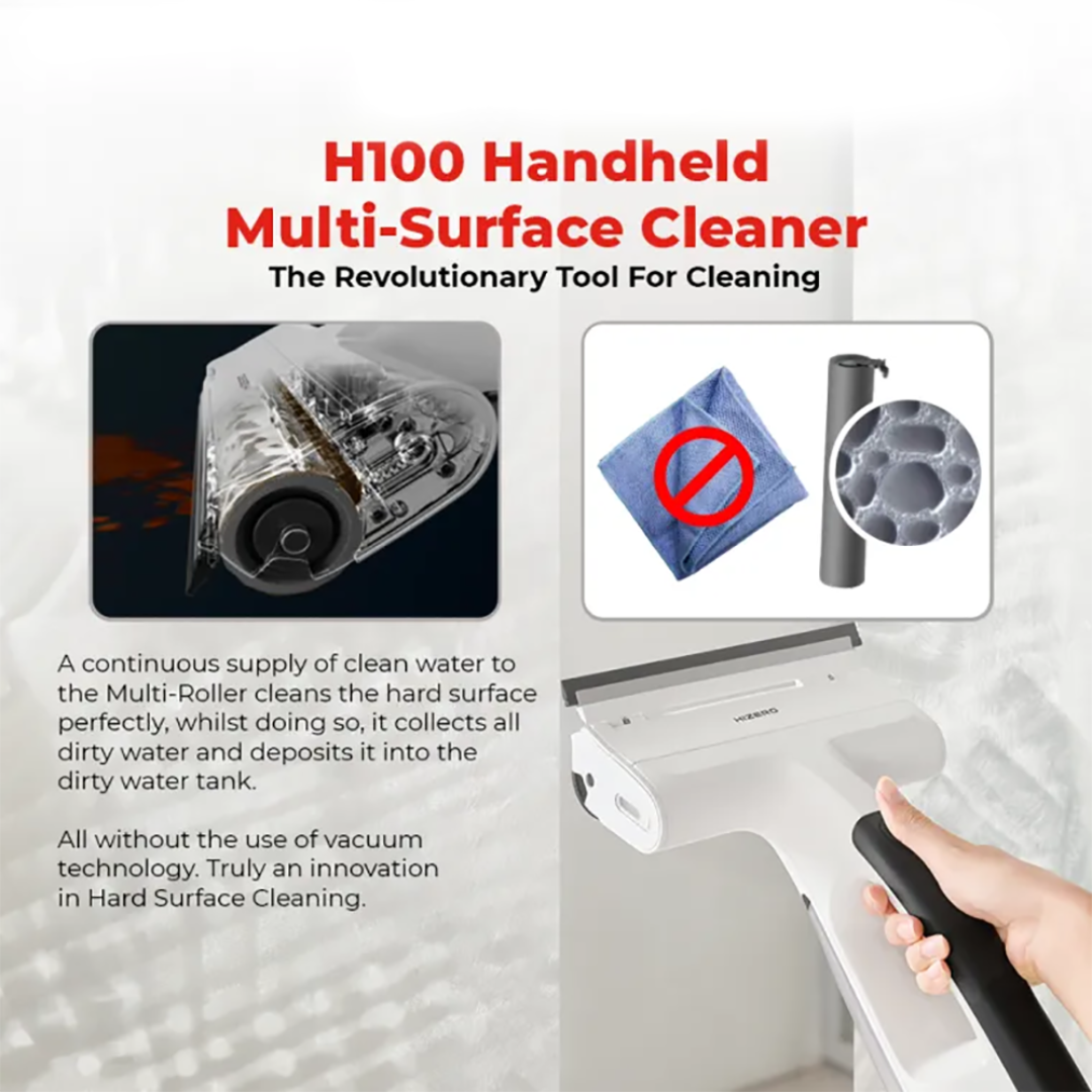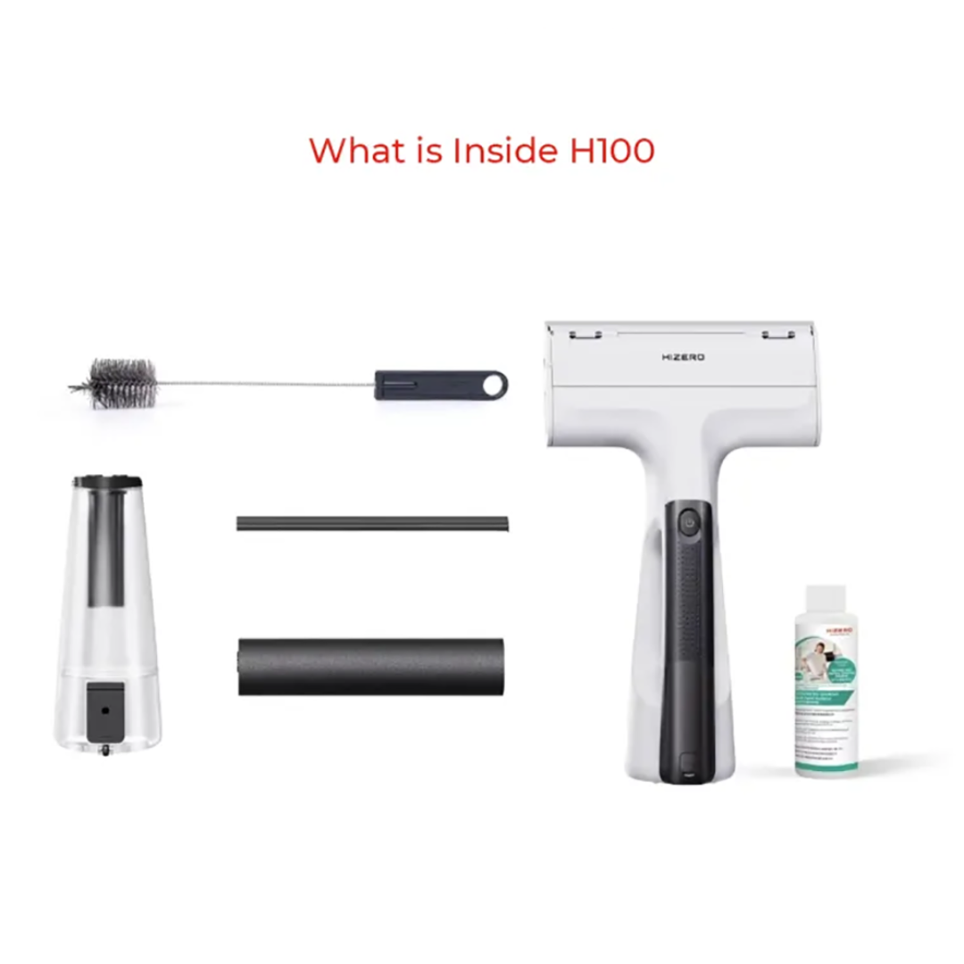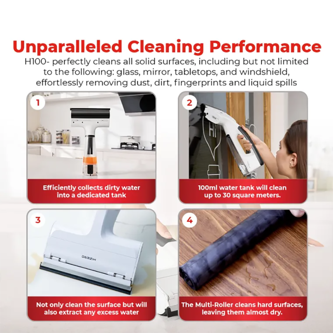 The Hizero H100 - Handheld Multi-Surface Cleaner The Revolutionary Tool for cleaning, perfectly cleans all solid surfaces, including but not limited to the following: glass, mirror, tabletops, and windshield, effortlessly removing dust, dirt, fingerprints and liquid spills