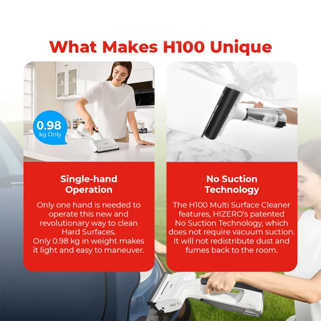 •The H100 Multi Surface Cleaner features, HIZERO’s patented No Suction Technology, which does not require vacuum suction. It will not redistribute dust and fumes back to the room.